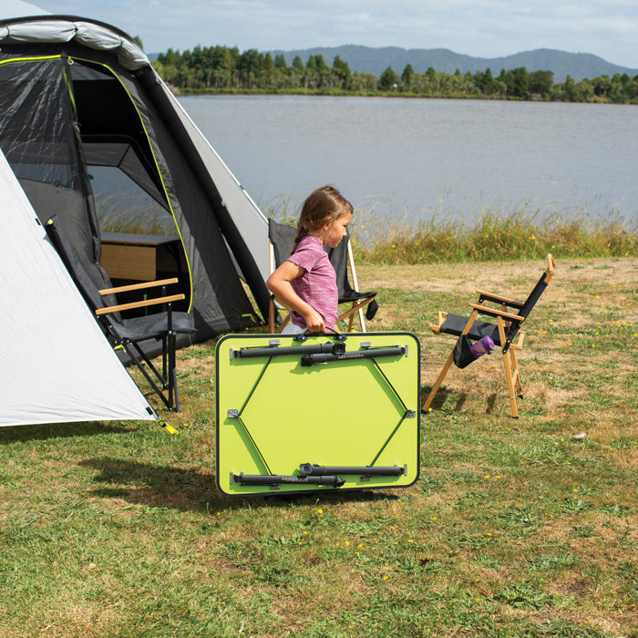 The Hexolite 80 has an ideal surface for cooking and meal prep and a wide base pivoting feet to provide more stability on uneven ground. Also, the table height can be adjusted and locked in with the flick of a lever on the individual legs.