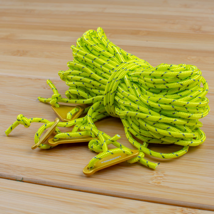 These 3.5mm polyester guy ropes are strong, UV resistant, and low-stretch, perfect for anchoring tents in challenging weather. The hi-vis colour and reflective strips woven into the sheath make them easier to see in low light. The Bright Guy Rope Set comes with 4x 5m pre-cut lengths and aluminium tri sliders for precise tensioning. Recommended for ZEMPIRE® Pro and Evo Series tents.