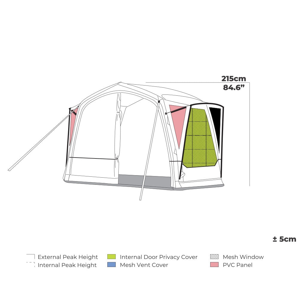 Boasting oversized air tubes for exceptional wind stability and a rapid two-minute inflation, setup is swift and straightforward. Near-vertical side walls and full head height deliver generous internal space, while two side access doors with protective brow pole awnings promote superior ventilation and convenience — each fully enclosable or openable with mesh panels. The included waterproof wall fully encloses the front opening for complete weather protection, while three-way windows and tinted PVC skylights offer premium light and ventilation options.